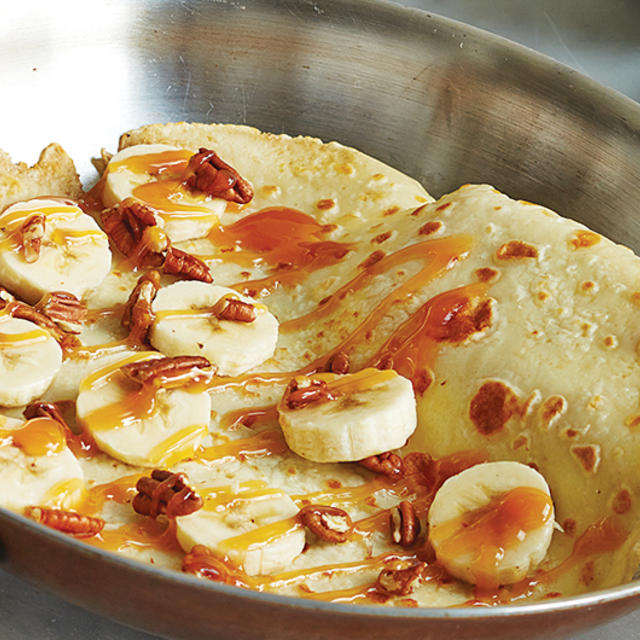 Spread 1 tbsp (15 mL) of the caramel sauce thinly over each crepe. Cover half of each crêpe with 1/4 of the banana slices and 1 tbsp (15 mL) of the pecan pieces. Fold each crepe in half, then fold again to form a triangle. Serve warm or cold.