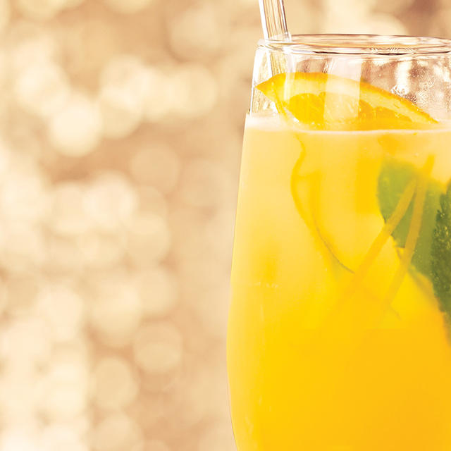 Fill each glass halfway with the prepared citrus juice and top up with ice and tonic water. Garnish with a slice of orange and an additional sprig of mint to serve.