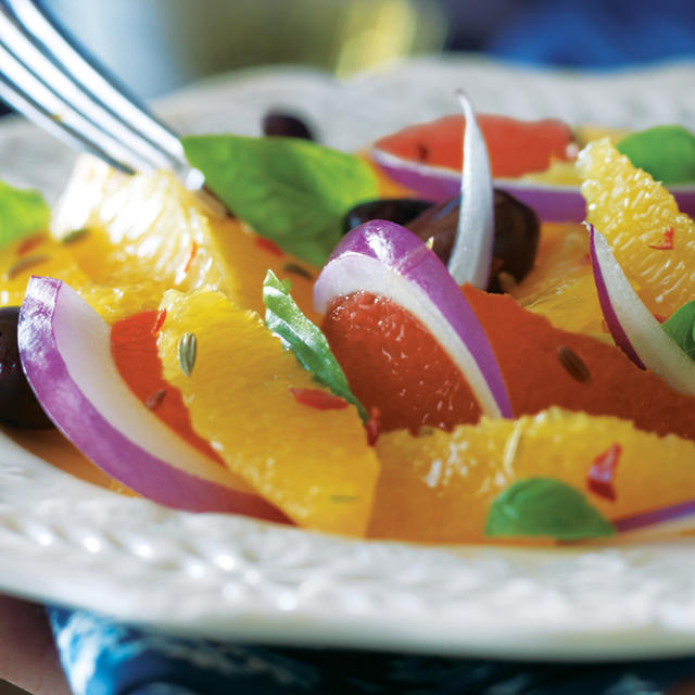 In a large bowl, combine orange segments, red onion and olives. Add basil, fennel seeds, pepper flakes and salt. Drizzle with olive oil; toss together. Serve immediately.