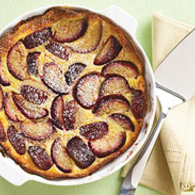 Stir batter and pour evenly over plums. Bake until puffed, set and golden brown around the edges, 40min. Let cool for 10 min; dust with icing sugar and serve.