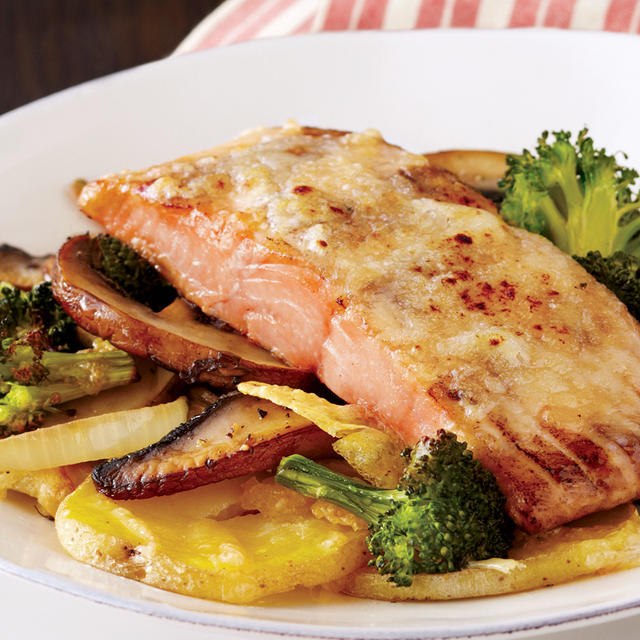 Bake uncovered in a preheated 400°F (200°C) oven until the cheese is golden, the salmon flakes with a fork and the vegetables are tender, about 35 min. from frozen or 25 min. if baking from fresh. Let stand 5 min. before serving.