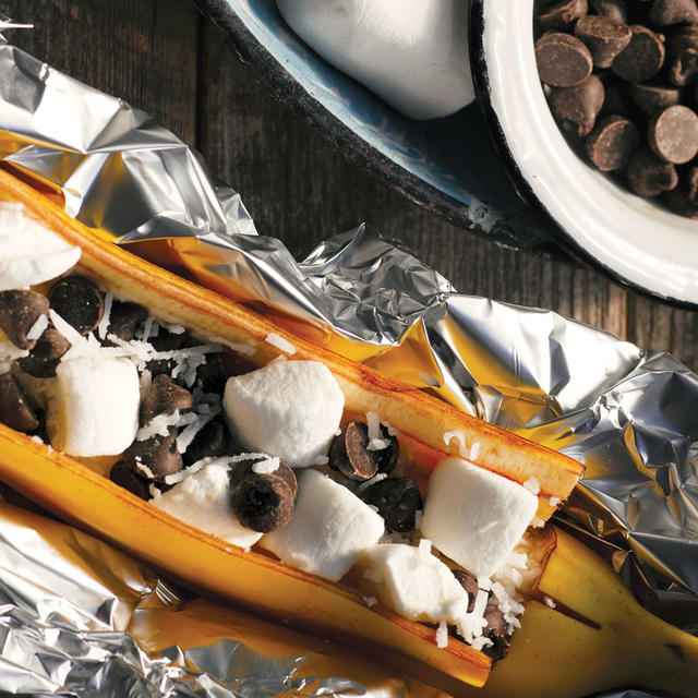 Cook your banana boats on a grate if your campfire is still going strong or place them directly on glowing embers if it’s dying out.