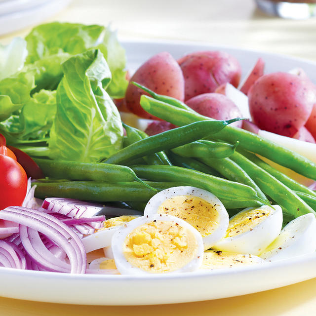 Cut potatoes into quarters and arrange in a section on a large platter. Fill rest of platter with sections of beans, lettuce, tomatoes, eggs and red onion.