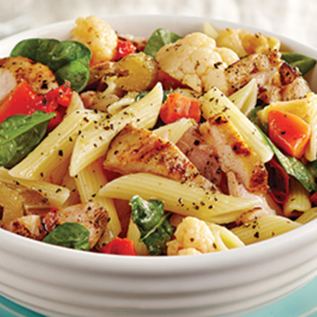 Toss cooked pasta with giardinera, pickle juice, the 1/3 cup (75 mL) olive oil, salt and pepper. Slice chicken and toss, along with the spinach, with pasta mixture.