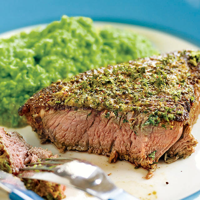 Preheat the oven to 375°F (190°C). Heat a heavy skillet over medium-high heat; coat lightly with cooking spray. Season the steaks with 1/8 tsp (0.5 ml) each salt and pepper and sear in the skillet for 1 to 2 min. on each side. Transfer steaks to a parchment paper-lined baking sheet and brush the mustard evenly onto the tops. Mix the parsley and 2 tsp (10 ml) tarragon together and press onto the mustard. Roast for 10 min. for medium (160°F/71°C on an instant-read thermometer).