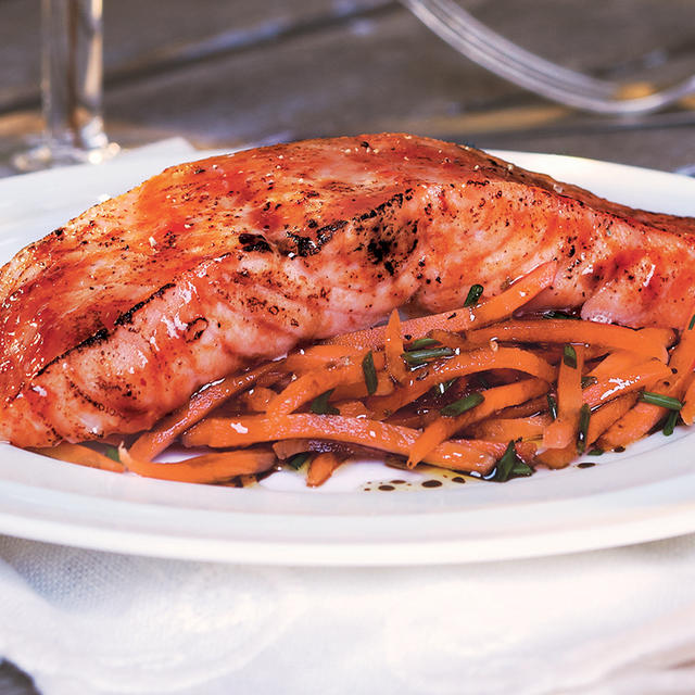 Brush additional 2 tbsp (30 mL) barbecue sauce over salmon and cook for 5 to 10 min. longer, until opaque and just cooked through. Meanwhile, mix chives into carrot slaw. Place slaw on 8 plates or a platter and top with maple salmon fillets.
