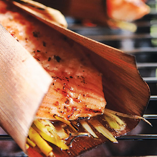 Divide leeks between the 4 wraps; place a salmon fillet in the centre of each wrap. Spoon 1 tbsp (15 mL) vinaigrette over each fillet. Secure wrap with string. Grill until salmon feels firm, 8 to 10 min., turning wraps over once during cooking.