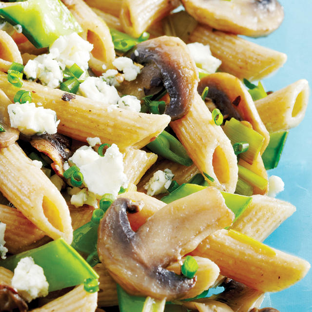 Meanwhile, heat 1 tbsp (15 mL) of the olive oil in a large skillet over medium-high heat. Add the mushrooms, cooking until lightly golden. Transfer the mushrooms to a plate. Return skillet to the heat, add the rest of the olive oil and cook the leeks, garlic and thyme, until tender, about 5 min. Return the mushrooms to the skillet, plus the snow peas and reserved pasta water. Cook, stirring, until snow peas are tender-crisp, about 2 min.