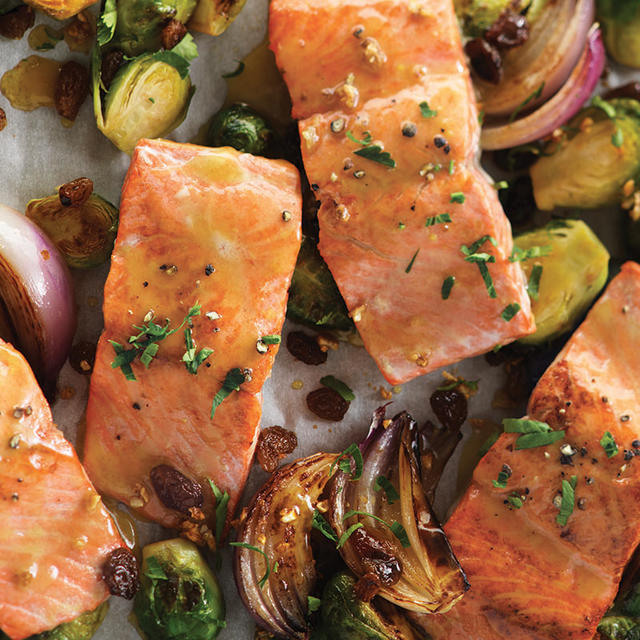 Remove baking sheet from oven and turn oven to broil. Sprinkle raisins onto Brussels sprout mixture, place salmon overtop and brush with reserved maple mixture. Place baking sheet back in oven and broil until salmon is slightly golden on top and flakes easily with fork, about 7 min. Sprinkle with parsley before serving.