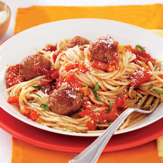 Meanwhile, bring a large saucepan of salted water to a boil and cook pasta according to package directions. As the pasta cooks, bake the meatballs according to package directions.