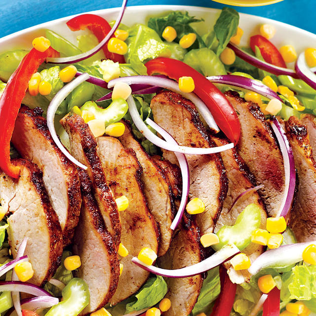 Arrange the shredded romaine on a platter. Top with the sliced pork, corn, red pepper, celery and onion. Drizzle with dressing and serve.