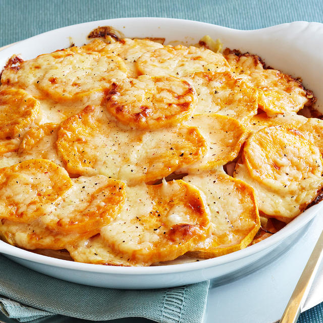 Arrange half the fennel in a single layer (overlapping slightly) in the bottom of a 13 x 9-in. (3 L) baking dish. Top with half the onion and sweet potatoes. Sprinkle with half the cheese. Repeat layers and then evenly drizzle cream sauce overtop. Cover with foil.