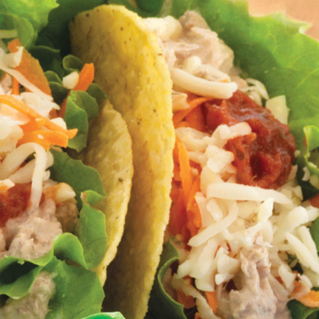Blend tuna and mayonnaise. Line taco shells with lettuce. Divide tuna mixture equally between shells. Top each with carrot and cheese, garnish with salsa. Transfer to a re-sealable container. Chill until ready to serve, up to four hours. Tip: If tacos will not be transported upright, place salsa in a smaller re-sealable container.